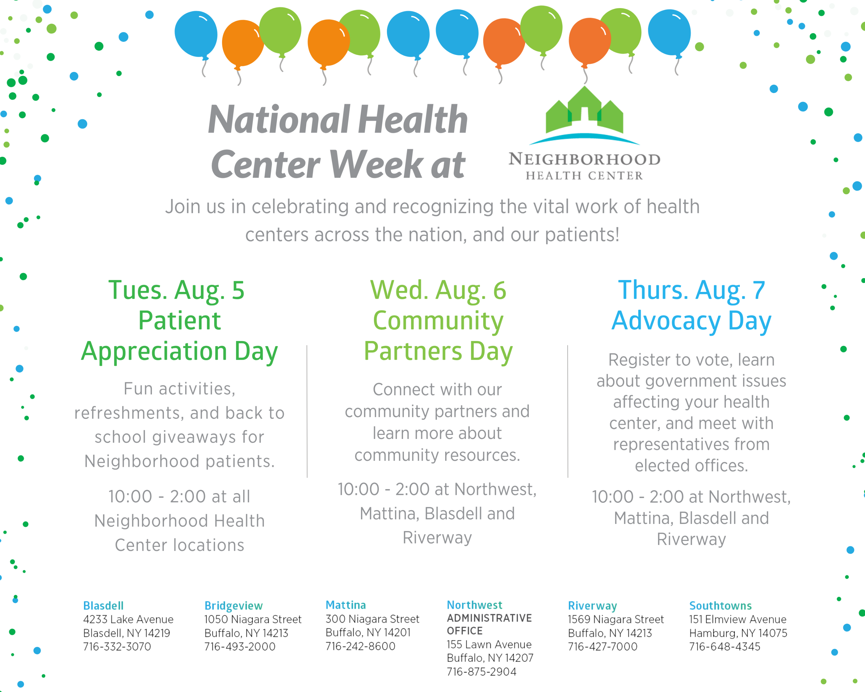Neighborhood Health Center will be hosting fun activities and giveaways for our patients throughout the week, and there will be many opportunities for you to connect with community partners and learn about resources available to you. Mark your calendars for the following celebrations: