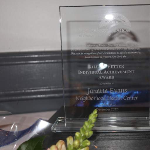 Congratulations are in order for Neighborhood Health Center’s Janette Evans, who was awarded the Killian Vetter Achievement Award at this year’s Homeless Alliance of Western New York’s Annual Luncheon. Killian Vetter was one of the founders of the Erie County Commission on Homelessness. The Killian Vetter Individual Achievement Award recognizes the hard work and dedication of an individual who has worked on behalf of homeless and low-income persons.